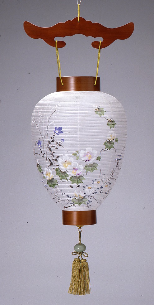 天井から吊るすタイプの提灯です。絹張で幻想的に灯がともります。